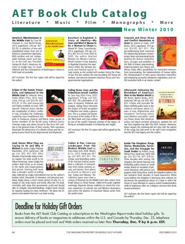 Deadline for Holiday Gift Orders Books from the AET Book Club Catalog or subscriptions to the Washington Report make ideal holiday gifts. To ensure delivery of books or magazines to addresses within the U.S. and Canada by Thursday, Dec. 23, telephone orders must be placed and mail and Web orders received no later than Thursday, Dec. 9 by 6 p.m. EST. 68