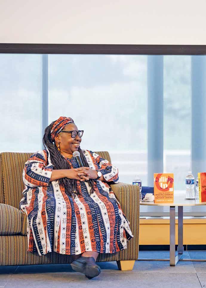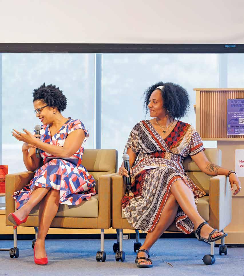 On this spread Reproductive justice pioneer Loretta Ross (left) headlined a September 2024 public symposium organized by Professor of Sociology Zakiya Luna (center) and Assistant Professor of Psychological and Brain Sciences Seanna Leath (right). Community members were invited into conversations with scholars and local and global activists about how to support reproductive justice in the current political climate.
