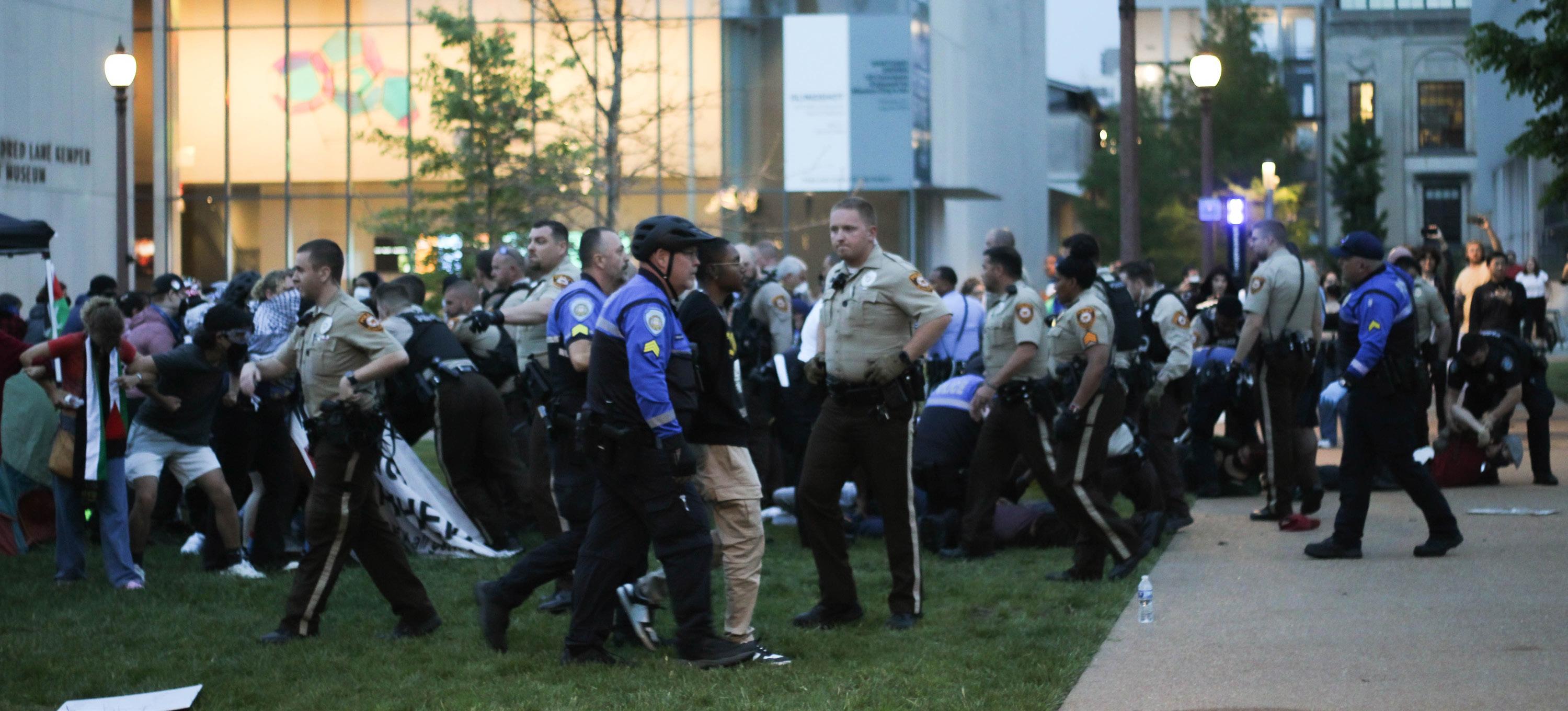 WUPD and local law enforcement disperse a crowd of protesters in front of Kemper Art Museum on April 27.
