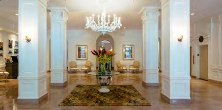 14th floor resident lounge with chef’s kitchen, open seating area with fireplace, serving counter and dining area