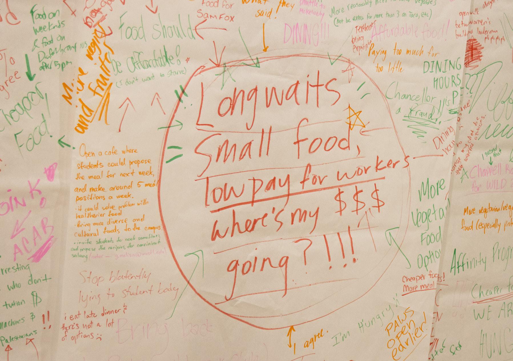 Students express their concerns with Dining Services on an SU poster asking about how to improve the University.