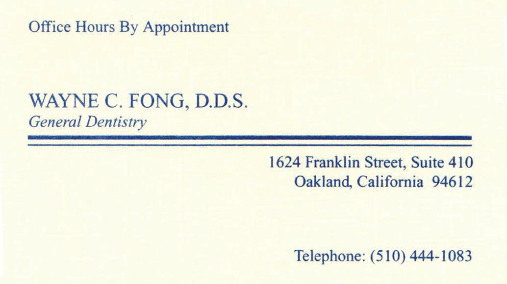 69 A Chinatown OptometristDr. David Hoh 56 Asian Health Services 3 Asian Network Pacific Homecare & Hospice 49 Bank of the Orient 71 Bay Auto Center 65 Bay Cities Realty and Services, Inc. - Bill Kwong 64 Bay Cities Realty and Services, Inc.Olivia Chung 64 Becker Boards 43 Big Dish Chinese Cuisine 51 Boba Binge 41 Bradford Pharmacy 47 CarePlus Chiropractic Health Center 47 Century 21 - Steven Cheung 56 Chang & Hardeman 65 Children's Fairyland 61 Chinese American Citizens Alliance 66 Chinese Community United Methodist Church 56 Chinese Medicine & Acupressure Center 67 Chinese Presbyterian Church of Oakland 57 Chiropractic Health Center 67 Commonwealth Management, Inc. 63 D'Star Insurance Agency, Inc 55 East Bay Vision Center Optometry 49 East Ocean Restaurant 57 ENGRAVIT 58 Episcopal Church of Our Saviour 57 Family Bridges 54 Fong, Wayne C., DDS 46 Friends of Lincoln Squre Park 10 Fung, Harold K., DMD 46 Going Places 68 Goldengate Restaurant Equipment Co. 59 Goldenland Investments 64 Hanoi Chicken Noodle Restaurant 52 J. Miller Flowers and Gifts 58 Jing Long Jewelry 41 King of Grocery 66 Kuo, Elisa L. DDS, Inc. 47 Lee, Stephen, DDS and Fong, Diana, DDS 46 Long Pat Market 66 Lounge Chinatown 62 Luxe Concepts Windows and Glass 44 Merchant Real Estate, Inc. 64