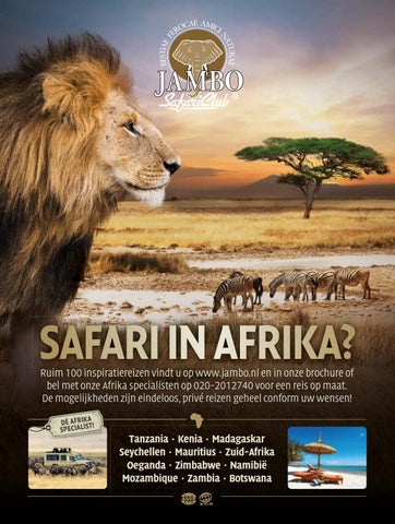 SAFARI IN AFRIKA? Ruim 100 inspiratiereizen vindt u op www.jambo.nl en in onze brochure of bel met onze Afrika specialisten op 020-2012740 voor een reis op maat. De mogelijkheden zijn eindeloos, privé reizen geheel conform uw wensen! DÈ AFRIKAT! SPECIALIS
