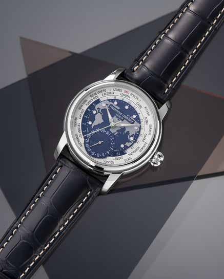 De Classics Worldtimer Manufacture werd in 2012 gelanceerd en ontwikkelde zich tot één van de best verkochte horloges van Frederique Constant. Tijd dus voor een jubileumfeestje. Het tienjarig bestaan wordt opgeluisterd met twee exclusieve uitvoeringen in beperkte oplages: de eerste in 18-karaats roségoud, met een oplage van 88 exemplaren, en de tweede in staal, in 1888 exemplaren. Beide horloges hebben een diameter van 42 mm. De twee nieuwe versies zijn voorzien van een diepblauwe kleur die doet denken aan de oceanen op een wereldkaart. Lichtgevende indexen, uur- en minutenwijzers zorgen voor een perfecte leesbaarheid, ook ‘s nacht. Vierentwintig steden prijken op een witte schijf, en op 6 uur wordt de datum weergegeven. Inwendig tikt het automatische kaliber FC-718 met een gangreserve van 38 uur. Alle functies kunnen met de kroon worden bediend, dankzij een ingenieus systeem met drie posities. De eerste positie is voor opwinden. In de tweede positie kan de datum (naar boven) en de stad (naar beneden) worden ingesteld. En in de derde positie kun je de centrale weergavetijd instellen. Kost € 3895 (staal); € 16.995 (goud).