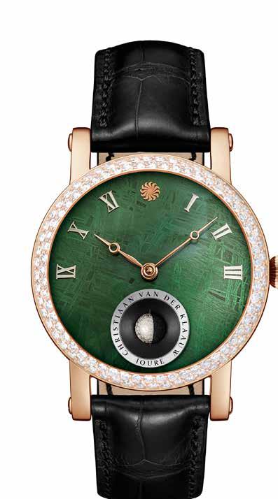 Christiaan van der Klaauw Astronomical Watches presenteert de hemelse samenkomst van een oogstrelend mooie wijzerplaat van groene meteoriet met daarin de meest nauwkeurige 3D maanfase ter wereld. In cijfers: de maan draait in precies 29,530588853 dagen rond de aarde. Deze handgemaakte 3D miniatuur maan geeft de maanfase zo nauwkeurig weer, dat hij slechts één dag afwijkt in 11.000 jaar. Fascinerend, niet? Nog fascinerender vinden wij het om na te denken over hoe lang de meteoriet op weg is geweest naar onze aarde om uiteindelijk te belanden in een pronkstuk rond iemands pols. Daarbij vallen die 11.000 jaar waarschijnlijk in het niet, hoe imposant ze ook zijn. Uitgerust met een prachtig gedecoreerd automatisch uurwerk, dat zichtbaar is door de glazen kastbodem. De CVDK Real Moon Joure Green Meteorite is leverbaar in staal, roségoud en witgoud vanaf € 39.950