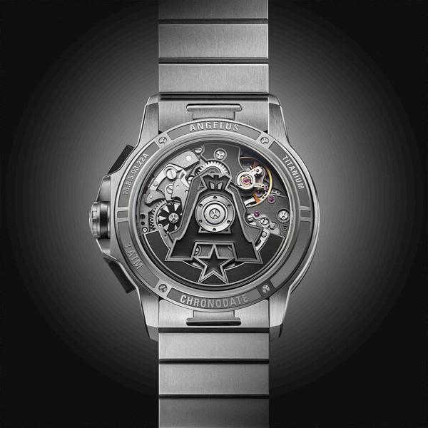 Hablando de la parte técnica de la pieza, debemos decir que sus creadores lo han dotado de un movimiento de cronógrafo enteramente desarrollado por Angelus, el A500 que ofrece una frecuencia de 4 Hz–28,800 alternancias por hora–, así como una reserva de marcha de 60 horas que se logra gracias a una masa oscilante que se ha terminado con un detalle histórico de la marca. La letra “A”, que le da forma, se ha colocado sobre una estrella, que recuerda a una campana y su badajo Un diseño rescatado de los archivos de la firma