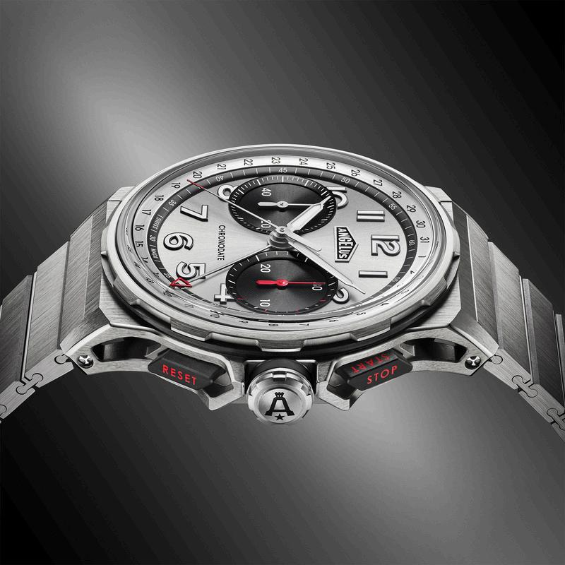 Chronodate Titanium de Angelus se entrega con brazalete de titanio con eslabones satinados, así como de una elegante y deportiva correa de caucho con una hebilla, también de titanio Este guardatiempos encanta por su estética contemporánea y su brillante desempeño técnico de cronógrafo y fecha periférica