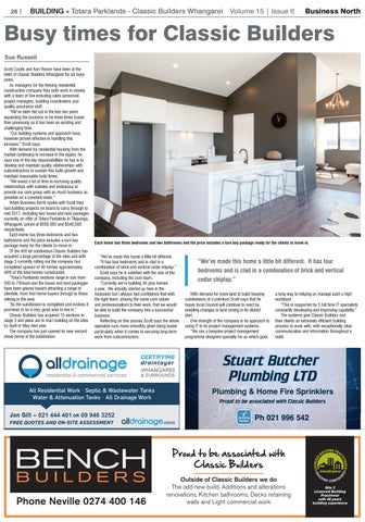 Busy times for Classic Builders Sue Russell Scott Coutts and Ken Vinson have been at the helm of Classic Builders Whangarei for six busy years. As managers for the thriving residential construction company they both work in closely with a team of five including sales personnel, project managers, building coordinators and quality assurance staff. “We’ve been flat out in the last two years expanding the business to be three times busier than previously so it has been an exciting and challenging time. “Our building systems and approach have, however proven effective in handling this increase,” Scott says. With demand for residential housing from the market continuing to increase in the region, he says one of the key responsibilities he has is to develop and maintain quality relationships with subcontractors to sustain this build growth and maintain reasonable build times. “We invest a lot of time in nurturing quality relationships with subbies and endeavour to provide our core group with as much business as possible on a constant basis.” When Business North spoke with Scott they had building projects on board to carry through to mid 2017, including two house and land packages currently on offer at Totara Parkalnds in Tikipunga, Whangarei, priced at $550,000 and $540,000 respectively. Each home has three bedrooms and two bathrooms and the price includes a turn key package ready for the clients to move in. Of the 400 lot subdivision Classic Builders has acquired a large percentage of the sites and with stage 3 currently rolling out the company has completed upward of 40 homes approximately 40% of the total homes constructed. “Totara Parklands sections range in size from 550 to 750sqm and the house and land packages have been geared toward attracting a range of clientele, from first-home buyers through to those retiring in the area. “As the subdivision is completed and evolves it promises to be a very good area to live in.” Classic Builders has acquired 15 sections in stage 3 and plans are to start building on the sites by April or May next year. The company has just opened its new second show-home in the subdivision.