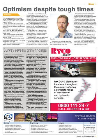 Optimism despite tough times Jo Bailey There were sparks of optimism amongst the negative outlook at this year’s AusIMM NZ Branch conference, says Rene Sterk, chairperson of the organising committee. “Times are obviously still really tough with commodity prices low, people continuing to be laid off and very little new expenditure or investment in the industry. “However, some speakers at the conference said it is not all bad news, citing OceanaGold’s great progress and Newcrest’s big ideas and plans for New Zealand.” More than 250 delegates attended the event, which was held in Dunedin for the first time in more than 10 years. “Numbers were a little down on last year, but considering the state of the industry it was a pretty decent turnout,” says Sterk. With such a variety of speakers and sessions, he says it is difficult to pick a highlight.