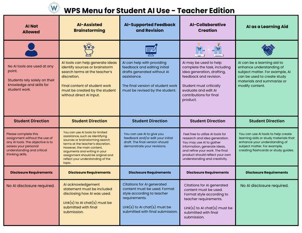 TheWPSMenuforStudentAIUse-TeacherEditionwillbeusedto determinehowmuchAIsupportwillbeallowedforassignments.The WPSMenuforStudentAIUseisforstudentreferenceandshouldbe displayedinclassrooms.