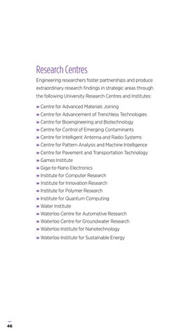 Research Centres Engineering researchers foster partnerships and produce extraordinary research findings in strategic areas through the following University Research Centres and Institutes: » Centre for Advanced Materials Joining » Centre for Advancement of Trenchless Technologies » Centre for Bioengineering and Biotechnology » Centre for Control of Emerging Contaminants » Centre for Intelligent Antenna and Radio Systems » Centre for Pattern Analysis and Machine Intelligence » Centre for Pavement and Transportation Technology » Games Institute » Giga-to-Nano Electronics » Institute for Computer Research » Institute for Innovation Research » Institute for Polymer Research » Institute for Quantum Computing » Water Institute » Waterloo Centre for Automotive Research » Waterloo Centre for Groundwater Research » Waterloo Institute for Nanotechnology » Waterloo Institute for Sustainable Energy