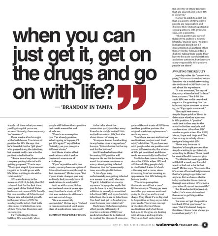 simply tell them what you want, you’ll get a quick yes or no answer. Honestly, there are rarely ‘no’ answers.” Three weeks after his night at the bath house, Travis tested positive for HIV. He says that he’s thankful for the “gift giver” who passed along the infection, but doesn’t really care who the particular individual is. “I know some bug chasers who compare getting infected with getting pregnant,” Travis says. “That’s just stupid. I just wanted to get it so I could go on with life. It has nothing to do with a relationship.” HIV made history in the summer of 2013. In July, the CDC released that for the �irst time, every part of the United States had reported cases of HIV. Locally, the communities of Orlando and Tampa saw substantial growth in the prevalence of HIV. So much growth, in fact, that both cities now rival infection rates of New York, San Francisco and Los Angeles. It’s frustrating for those battling HIV, especially when