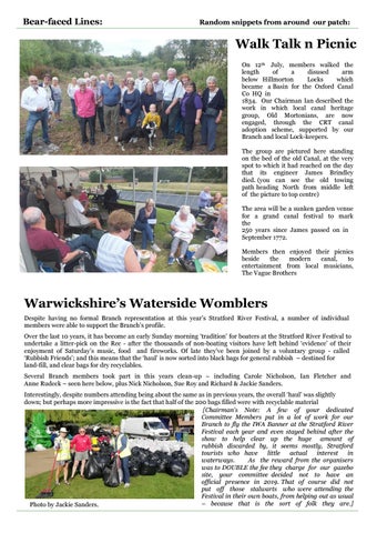 Warwickshire’s Waterside Womblers Despite having no formal Branch representation at this year’s Stratford River Festival, a number of individual members were able to support the Branch’s profile. Over the last 10 years, it has become an early Sunday morning ‘tradition’ for boaters at the Stratford River Festival to undertake a litter-pick on the Rec - after the thousands of non-boating visitors have left behind ‘evidence’ of their enjoyment of Saturday’s music, food and fireworks. Of late they’ve been joined by a voluntary group - called ‘Rubbish Friends’; and this means that the ‘haul’ is now sorted into black bags for general rubbish – destined for land-fill, and clear bags for dry recyclables. Several Branch members took part in this years clean-up – including Carole Nicholson, Ian Fletcher and Anne Rudeck – seen here below, plus Nick Nicholson, Sue Roy and Richard & Jackie Sanders. Interestingly, despite numbers attending being about the same as in previous years, the overall ‘haul’ was slightly down; but perhaps more impressive is the fact that half of the 200 bags filled were with recyclable material [Chairman’s Note: A few of your dedicated Committee Members put in a lot of work for our Branch to fly the IWA Banner at the Stratford River Festival each year and even stayed behind after the show to help clear up the huge amount of rubbish discarded by, it seems mostly, Stratford tourists who have little actual interest in waterways. As the reward from the organisers was to DOUBLE the fee they charge for our gazebo site, your committee decided not to have an official presence in 2019. That of course did not put off those stalwarts who were attending the Festival in their own boats, from helping out as usual – because that is the sort of folk they are.] Photo by Jackie Sanders.