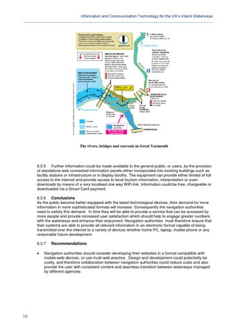6.3.5 Further information could be made available to the general public, or users, by the provision of standalone web connected information panels either incorporated into existing buildings such as facility stations or infrastructure or in display booths. The equipment can provide either limited of full access to the internet and provide access to local tourism information, interpretation or even downloads by means of a very localised one way WiFi link. Information could be free, chargeable or downloaded via a Smart Card payment. 6.3.6 Conclusions As the public become better-equipped with the latest technological devices, their demand for more information in more sophisticated formats will increase. Consequently the navigation authorities need to satisfy this demand. In time they will be able to provide a service that can be accessed by more people and provide increased user satisfaction which should help to engage greater numbers with the waterways and enhance their enjoyment. Navigation authorities must therefore ensure that their systems are able to provide all relevant information in an electronic format capable of being transmitted over the internet to a variety of devices whether home PC, laptop, mobile phone or any reasonable future development. 6.3.7 