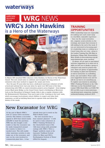 TRAINING OPPORTUNITIES WRG’s leadership teams are responsible for making sure each canal camp is a fun-filled, enjoyable experience – they run the canal restoration site, organise social activities in the evenings, and ensure that everyone is still smiling by the end of the week. If you are interested in becoming part of a leadership team or cooking on a Canal Camp why not come along to the Leaders Training Day (9th May) at Rowington Village Hall, Warwickshire. More details at www.waterways.org.uk/ wrg/volunteer/get_more_involved. As always, we are open to and indeed welcome suggestions as to what sort of skills you feel you or ideally a group of volunteers may need for projects this year. There are plenty of opportunities for training on plant and machinery as well as instruction on scaffolding, levels, vans and trailers. Please make your suggestions known soon and we will do our best to set something up. To register your interest in attending WRG’s Training Weekend on the 13th14th June on the Chesterfield Canal contact WRG Head Office on 01494 783 453 ext 604 or go to www.waterways. org.uk/wrg/canal_camps/wrg_training_ weekends/training_weekend_2015.