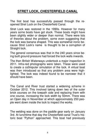 STRET LOCK, CHESTERFIELD CANAL The first boat has successfully passed through the reopened Stret Lock on the Chesterfield Canal. Stret Lock was restored in the 1990s. However for many years some boats have got stuck. These boats might have been slightly wider or deeper than normal. There were lots of theories about the problem, some even suggesting that the lock was banana shaped. This was somewhat ironic because Stret Lock’s name is thought to be a corruption of Straight lock. The general consensus was that in the 240 years since being built ground pressure had forced the lock walls inwards. The then British Waterways undertook a major inspection in 2011. Infra-red photographs were taken. These were used to create a co0mputer simulation of the lock. A virtual boat was then introduced so that any problem area were highlighted. The lock was indeed found to be narrower that it should have been. The Canal and River trust started a widening scheme in October 2012. This involved taking down two of the outer brick courses on the towpath side and replacing them with one course, increasing the lock width by 50mm. There was an Open day in November at which approximately 250 people went down inside the lock to inspect the works. The welding was done on the paddle gear early on January 3rd. At lunchtime that day the Chesterfield canal Trust’s historic boat ”Python” approached. This boat had previously