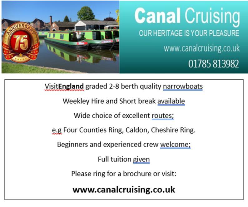 This year we are hoping to work with the Stoke-on-Trent Boat Club to organise a daytime or weekend family event in latesummer/early-autumn. I will hopefully have more details for you in the next Knobsticks. The Trent and Mersey Canal Society have kindly said that our members are very welcome to join them for their Christmas dinner, usually held at the Red Bull by T&M lock 43 in early December.