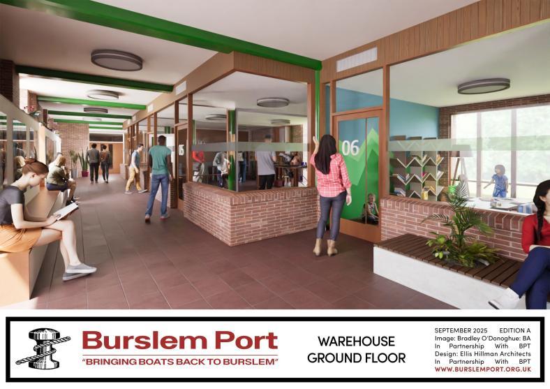 With a big thank you to Bradley, the internal visuals of our ideas for the old warehouse have really come to life. Based upon the original images provided by Ellis Hillman Architects, he is now showing, with much more realism and detail, how the first floor in particular can become a community hub for this part of Burslem. He even illustrates me giving a talk on Burslem Port! (Ed: See photo above)