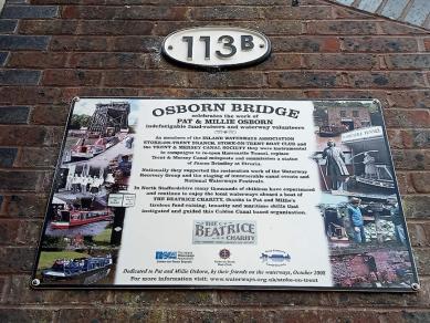 After lock 37 you go underneath the main railway line through Stoke and lock 36 is quite close and another quite deep one. The next section was re-routed when the A500 road was built and isn’t very pretty, although there is a bridge to look out for, named in honour of Pat and Millie Osborn who were very active IWA members, campaigners and volunteers.