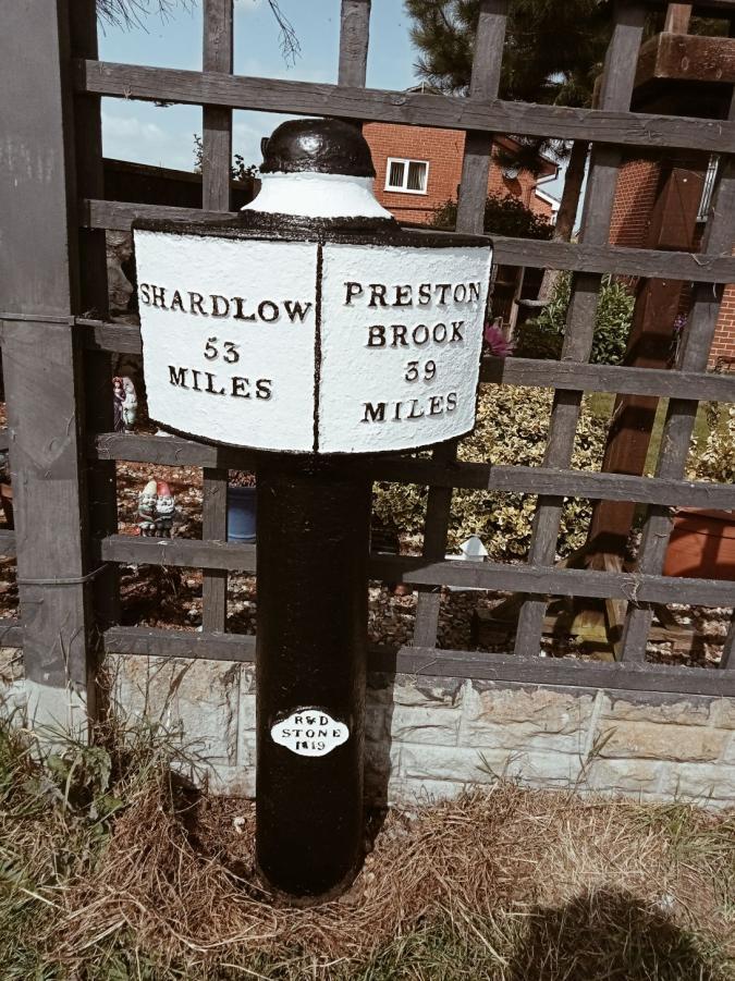 difference she has made to the one outside a garden in Trentham. Below there are another pair of before and after photos of the one at Sideway. When I congratulated her on the difference she had made, especially to the (previously indecipherable) makers plate, she expressed regret that she had missed the black dividing line between Shardlow and Preston Brook. I’m glad that she isn’t perfect …