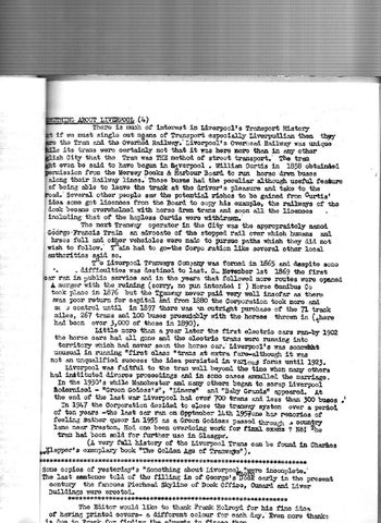 Er00L (lr) LE &uoh of Llltoregt r.E dverpoolr s frellBport td.storT lJ we uuet sirl8]"o ort Dger.s of lrelspof,t o9peoiaJlir livetTuducJx thea tlr5ry the Tra.a a!d. th6 orslheA Rat&rs0r. li"orpoolr s overheai, Bal,lwair re,s ud.qua its taars were oof,taLDlJr mt that Lt tras hero lorre t}Ia.[ ta 6qr otb5, City that tho frae was fHE EetheA of itt'oet tralBport.' 1116 ba! ove[ bo aaLd. to have beBun iro 0lverTool . ffiI1la! Curt.6 l'|1 1858 obt&t!A6d, iseion f,rou ttle Uers6lf Dookr & Ilarbour Bosrtd, to lua holae drrr1 busos rloog tbolr nol.l1rq, lftes.' thBE6 busEs had, t.b6 I,eouu.ar 4ltho(t$ usofirl featule of befug abLe to 16aye tbe traok at tire ih.lvgrt 6 pl3asure araa ts&e to tlr6 baA.'sovera]. otber people ss the poto[tial t'lohe; to bo gatuod, froa Qtrtlsr !,iIol sorne got llqeloeB fron tba Board to oopy his oxaEfile, tne failErys of tle aook beoaD€ orolrheLqea idtll horso ArrlyE traDE aad, sootr aai tJre ltoelrolt LrroludLug that of t}ra haplogs Gurttr lrol.s $ltjkl.ralr!3r fhe [e,.t rl.aDf,ay olerator lD tllo oLtJr rgas the 4pptroprattolnr aa@ed, *idfge.lralolr frai! an Bivooate of tho EtspleA :rail over-whioh Inrn;tts &rd hfse6 foII or,n onhor vohoLoles we!!e nailc to Inrfsue paths fibioh th6y dia aot rtsh to foulw. I.'BID haA to gs-15E Colpo fatlo!, lltlc ssreraf' othor looal 8lthorltles sEl.d. so. Co Llnor?oo!. TraEnrys C@oanf trea folEeA ln 1865 sDd daspLto rodo . aiffr.aultios na.s aosttuBd to ur ra6!r. '. 1ast. u_,uot6l,Dor 0:- noi€Dboti J-Br IBt 1869 .1509 the-ftrst 1lre i,last r ra! Ln pub],ic_ serrloo and. tll tho ysrrrs {tat f,olloweA t[o!o fout,e! sqre olEred. ( so!c]r, no prD &te!Aed, ! ) forse Orardbur Co .1, ogrger rrtttt tho -tElhihg took plsao ll1 L876 but tho flaDrray Davor par.d. ve:y ytg].1 iDsofar as thetB Malt poor retuB for oapttal a!d. fr.oE l88O tlre Coclporatlon took rqolo stcd, D( ,] control unttl ln 189? tbero var 1l1 otrH.ght-palrotrose of tfre 1 trao! s;j.les, 25-l tralss alla 1oO bus6s plolu$Ply wlti! tho horsss *rmm i" (*frore had b6ea ovor ,r0O0 of those fr f89O). trItt1o-uoro {1an B lrear 1+r tho *iret oleob.j. oars ?6r-t0r I9O2 tho horse gars had. a,l:! gotro aDa th6 oleottLo tr6@s re:re nlurLDr Lnto toritoty lyhioh hsd. tlovor loctl the horso oar.'IJl,vgtl,oolrg wa5 sonerllbt umtsu&1 Ln nrnnLn8 ofil'st olass ntraDs at extra, fet e-o^1i*rouSh it r6s [ot en utlqrsLifiod. aucooss th6 Ld.oa pefgisted, la vqraoug folirs trlrfi_f 192r. liveeool yas f,aj.tfiIl to tJt6 tra!-rel,1 beorotld, the tino rben riaqr othors had. lnltituted. d.lvomo pr:oooed.rngs and. l,rr aoo6 0!,106 a!@rllod. Ate a-anAage. I-a {lre L9ror r whl,le UorloheEtgr. a!d. neqr othons bogan to sorep i,fv.rpooi .Baby crs.Ea6tr ap;6iroa. troilertd,roa - ietEen CoilesEr a elrl.1 tlre ead. of.l*re lejt qar Livor?oo1 hsA orci 7m batls dd. ks;'tbaD ,OOAt bus66 .r 19,+7 th6 Cot?ora,tioa Aootd6A to glo-se tle tra&reir aystoE ove, a per,6oa of-Int€a y€ar5 -the ls,gt oar raE o!1 699tenber 14tll l95?onahas reoor.los of f€eItu8 ,ather quocr i.n 1955 as e OrecB Oodd.ess passod, +_h?^,!,^41 r oountr-, trano D6ar Feston. HoA ole boen ove*loLlg sor{c for ft-uaL--eiiffii ? N6! lL: kali had, bectr elA f,or firrther uEe L! Gl,asgglf, (.l, 1'ery fiLI hLstory of, tUo ltvonpoot lba,lE oa,n b6 fourd, Lr Charile! ereclpla.al' book rttle eolae! A6e of IraEw+B! ). ipapperr s
