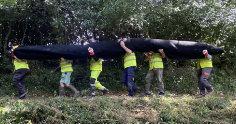 “July was marked by two extra work party days thanks to large numbers of corporate volunteers from Colas Rail during the week following the regular work party”. Said Tom Fulda, Shropshire Union Canal Society restoration project manager, reporting progress on SUCS volunteers’ ‘Crickheath South’ project to rebuild the Montgomery Canal channel southwards from the limit of navigation (since 2023) at Crickheath Wharf to the new Schoolhouse Bridge and beyond. “An enormous amount was achieved over these five days”. Work sweltered on four out of the five days (incorporating the country’s third heatwave of the year). However, torrential rain overnight on Saturday complicated matters and slowed progress on Sunday morning. Volunteers consoled themselves with the knowledge they hadn’t come here to remain clean.