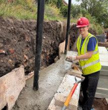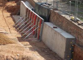 (5) Shuttering supported by metal stays and wooden formwork was then erected on this concrete base in preparation for the delivery of the concrete for the wall.