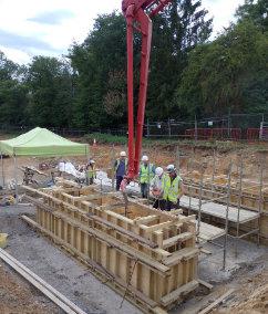 On Tuesday, the first van left at 7 a.m., as the first load of concrete was expected that day, and there was still a lot to prepare.Among other things, the next steel reinforcements had to be completed and placed in the shafts that still needed to be excavated, and the formwork for the concrete pour had to be installed and adjusted.All of this had to be done by 1 p.m. Things got a little hectic when the concrete delivery arrived at 12:30 p.m., half an hour earlier than expected. Luckily, the local volunteers were able to use some of the concrete for the base of their pedestrian lift bridge, giving us