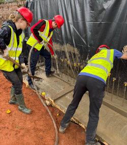 We had three deliveries of concrete during the week, but the firm were unable to deliver the one due on the Friday. We have calculated that we have given approximately 1,000 person-hours during the week, have pulled over 4,500 ties in the rebars and created 30 metres of new concrete rather than the 40 metres envisaged.