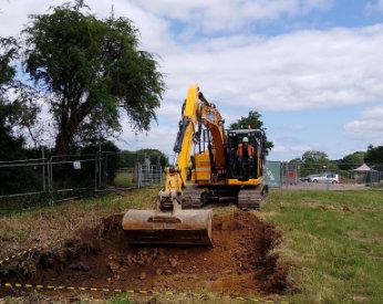 Our first job was to erect about 250 metres of tree protection fencing comprising Heras fence panels reinforced and anchored into the ground with scaffolding. A 3 day NWPG dig in March made a good start on this (and the site compound) with the local team completing the work in time to get sign off from the Council’s tree officer. Next task was to finish the compound set up – welfare unit, fuel cube, fencing and gates – together with the removal and re-positioning of fences and gates to provide a vehicle turning area.