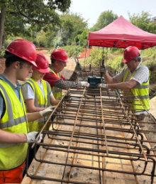 On Sunday, after a good breakfast together, we headed out to the site quite early, where we first unloaded the vans and stowed the tools in the designated containers.Afterwards, everyone was gradually assigned various tasks, including cutting rebar (reinforcing bar for the concrete), learning how to assemble a rebar cage, and digging the work pits at the other end of the work site. It took us until lunch break to assemble the first cage, as it wasn't easy to get into the swing of things at first. During the rest of the workday, we completed a total of three cages to the point where they could be relocated the next day.