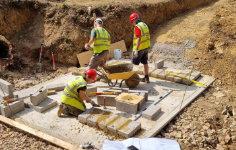 Here the length of time gaining planning permission was to the Trust’s benefit as the landowner passed away and the farm went to his daughter, who had no wish to enforce the self-imposed weight limit on the bridge. The risk was one for the Trust. Trial pits were dug and calculations made, with the engineers concluding that with some additional surfacing over the arch top, 40 ton lorries could cross the bridge. Without this, the Canal Camps would have had to spend their two weeks building a temporary access road rather than getting on with the actual construction work.