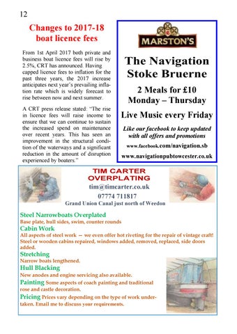 Changes to 2017-18 boat licence fees From 1st April 2017 both private and business boat licence fees will rise by 2.5%, CRT has announced. Having capped licence fees to inflation for the past three years, the 2017 increase anticipates next year’s prevailing inflation rate which is widely forecast to rise between now and next summer. A CRT press release stated: “The rise in licence fees will raise income to ensure that we can continue to sustain the increased spend on maintenance over recent years. This has seen an improvement in the structural condition of the waterways and a significant reduction in the amount of disruption experienced by boaters.”