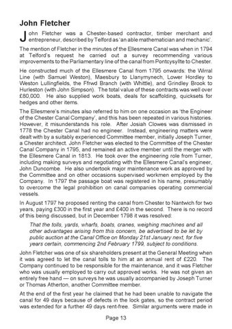The mention of Fletcher in the minutes of the Ellesmere Canal was when in 1794 at Telford’s request he carried out a survey recommending various improvements to the Parliamentary line of the canal from Pontcysyllte to Chester. He constructed much of the Ellesmere Canal from 1795 onwards: the Wirral Line (with Samuel Weston), Maesbury to Llanymynech, Lower Hordley to Weston Lullingfields, the Ffrwd Branch (with Whittle), and Grindley Brook to Hurleston (with John Simpson). The total value of these contracts was well over £80,000. He also supplied work boats, deals for scaffolding, quicksets for hedges and other items. The Ellesmere’s minutes also referred to him on one occasion as ‘the Engineer of the Chester Canal Company’, and this has been repeated in various histories. However, it misunderstands his role. After Josiah Clowes was dismissed in 1778 the Chester Canal had no engineer. Instead, engineering matters were dealt with by a suitably experienced Committee member, initially Joseph Turner, a Chester architect. John Fletcher was elected to the Committee of the Chester Canal Company in 1795, and remained an active member until the merger with the Ellesmere Canal in 1813. He took over the engineering role from Turner, including making surveys and negotiating with the Ellesmere Canal’s engineer, John Duncombe. He also undertook major maintenance work as approved by the Committee and on other occasions supervised workmen employed by the Company. In 1797 the passage boat was registered in his name, presumably to overcome the legal prohibition on canal companies operating commercial vessels. In August 1797 he proposed renting the canal from Chester to Nantwich for two years, paying £300 in the first year and £400 in the second. There is no record of this being discussed, but in December 1798 it was resolved: That the tolls, yards, wharfs, boats, cranes, weighing machines and all other advantages arising from this concern, be advertised to be let by public auction at the Canal Office on Monday 21st January next, for five years certain, commencing 2nd February 1799, subject to conditions. John Fletcher was one of six shareholders present at the General Meeting when it was agreed to let the canal tolls to him at an annual rent of £220. The Company continued to be responsible for the maintenance, and it was Fletcher who was usually employed to carry out approved works. He was not given an entirely free hand — on surveys he was usually accompanied by Joseph Turner or Thomas Atherton, another Committee member. At the end of the first year he claimed that he had been unable to navigate the canal for 49 days because of defects in the lock gates, so the contract period was extended for a further 49 days rent-free. Similar arguments were made in Page 13