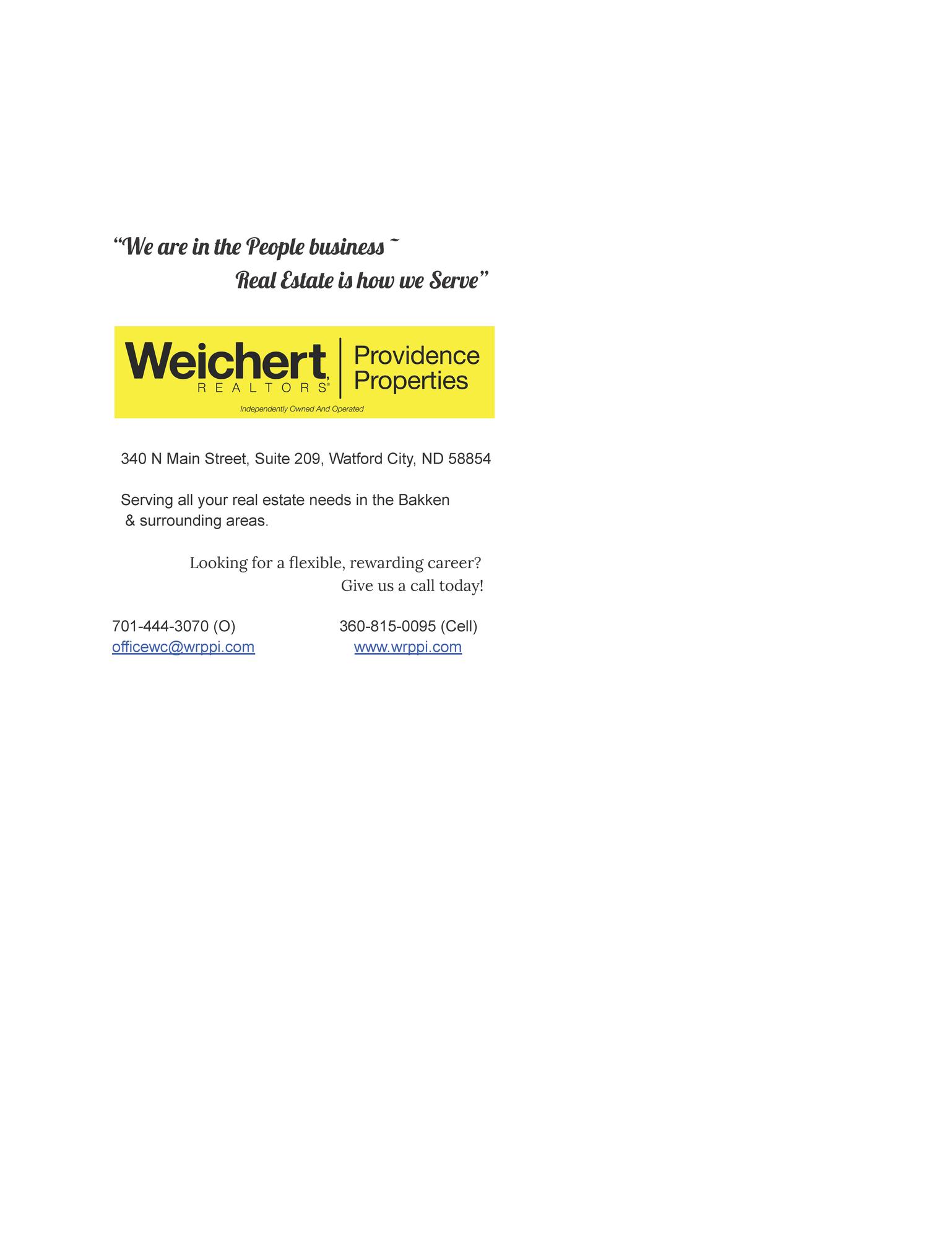 ! K E E P I N T O U C H ! @ w c p a r k s a n d r e c r e a t i o n w a t f o r d c i t y p a r k s . c o m Office Hours: Monday - Friday 8:00am - 5:00pm Address: 2209 Wolves Den Parkway Email: info@roughridercenter com Phone Number: (701) 842-3665 Providing cohesion and love of recreation to meet the needs of our community.