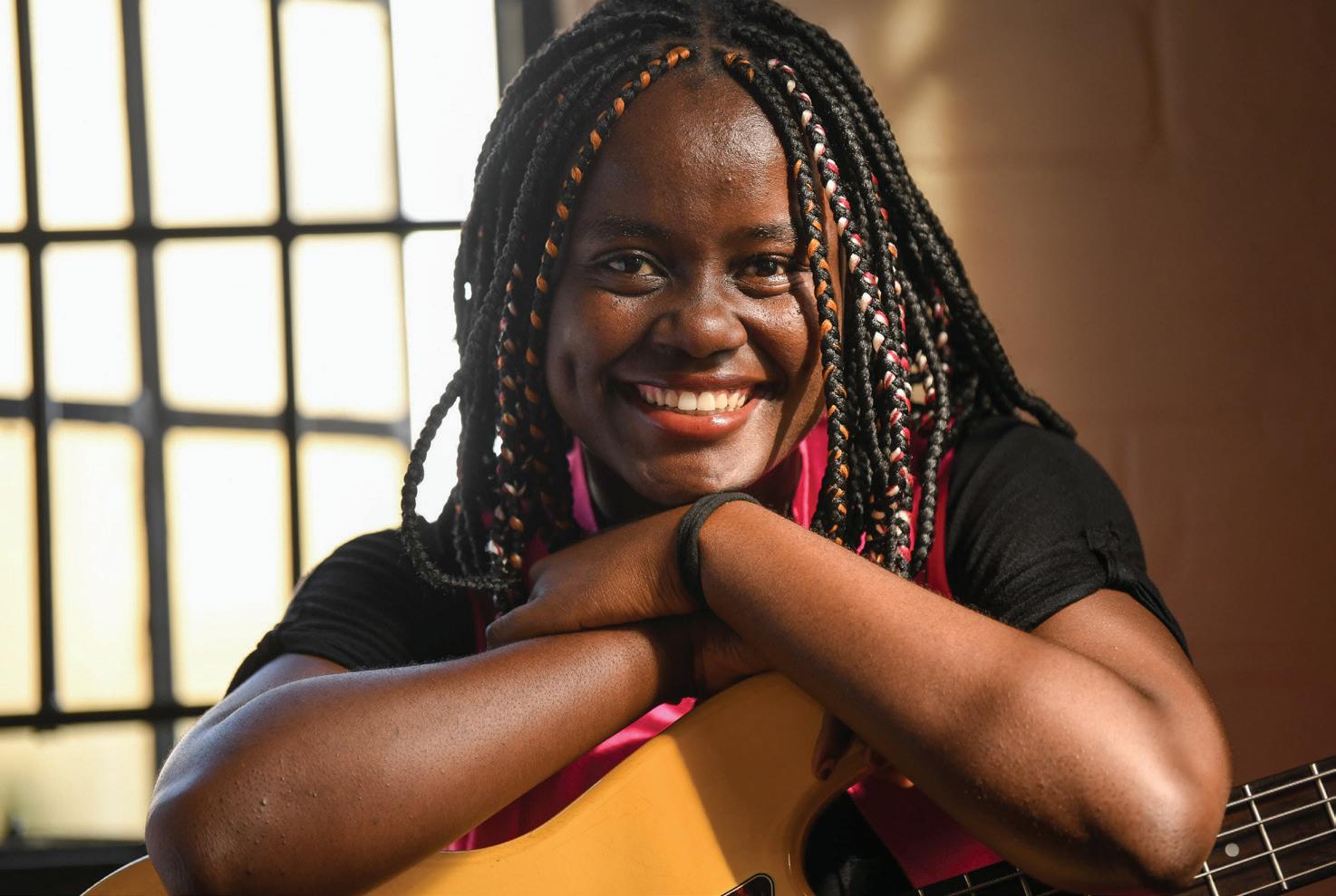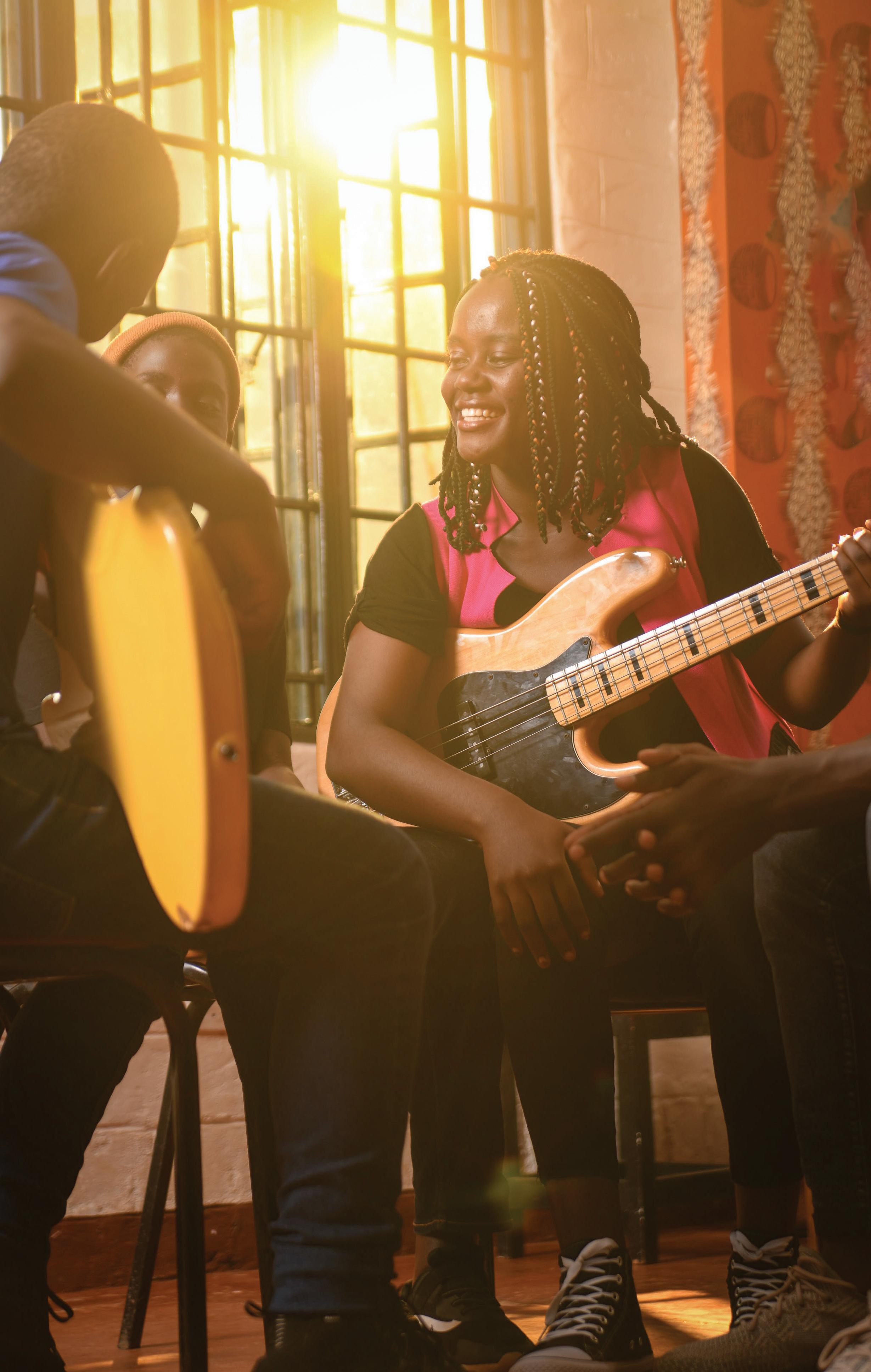 With a deep love for music, particularly the bass guitar, she completed high school and is now majoring in music at Kyambogo University.