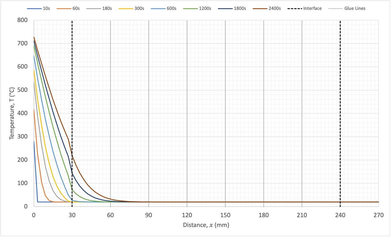 Equations 6-10 are explicit, meaning that all the unknown nodal temperatures at t(p+1) are determined exclusively by applying the known nodal temperatures at t(p). In this way, the distribution of temperature throughout the depth of the cross-section is obtained by running the model for a defined period of time, using intervals of ∆� . It must also be noted, that when running the model, it was found that the temperature fell to the residual ambient temperature much before the returning boundary from timber back to gypsum. As a result, these boundary condition equations have not been included as the model stopped iterating.