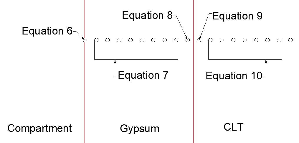 The equations vary at the compartment-gypsum boundary and the gypsum-structural timber boundary as to preserve the homogeneity of the energy transfer. The total energy being inputted into a single node must equal that of the energy out of that node, plus the thermal energy absorbed by that node. The complexities arise due to the combination of both materials at a singular node, requiring more detailed formulae to account for the properties of both materials.