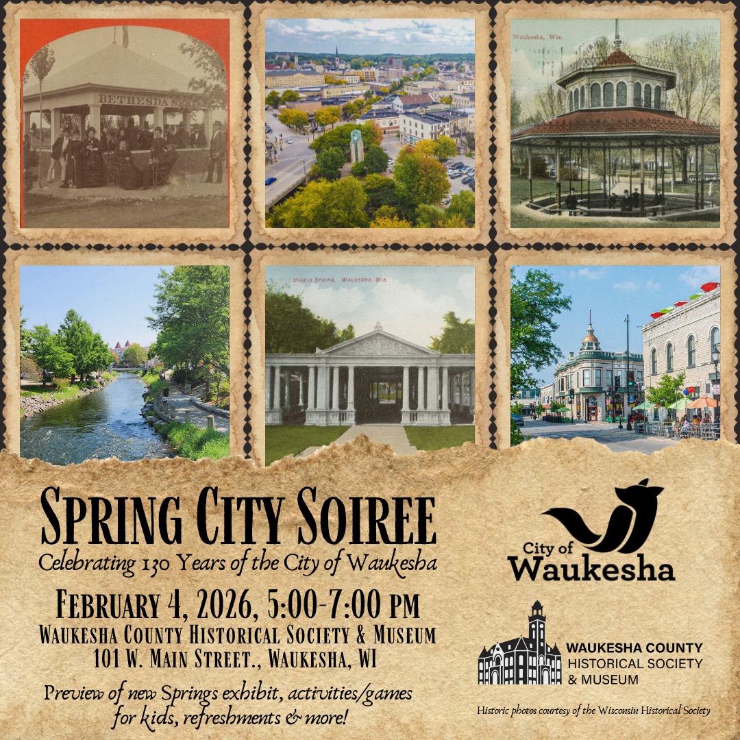 WeinviteyoutocelebratetheCity’sanniversarywithusatthe SpringCitySoiree,hostedattheWaukeshaCountyHistorical SocietyandMuseum,onFebruary4,2026from5:00pm to7:00 p.m.Therewillalsobeadditionalwaystocelebratethroughoutthe year