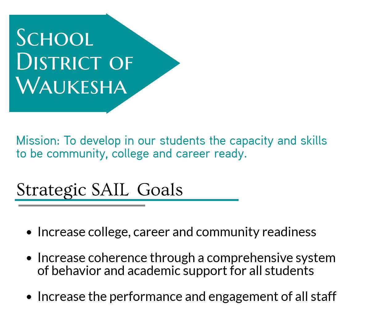 The School District of Waukesha began to do the work of SAIL (School Administrator Institute for Transformational Leadership) in 2014-15 as district administrator and teacher leader teams participated in SAIL. Framed and supported by the district leadership team, each school’s focused work led to creation of their vision to support best literacy practices and to provide professional development around those practices.