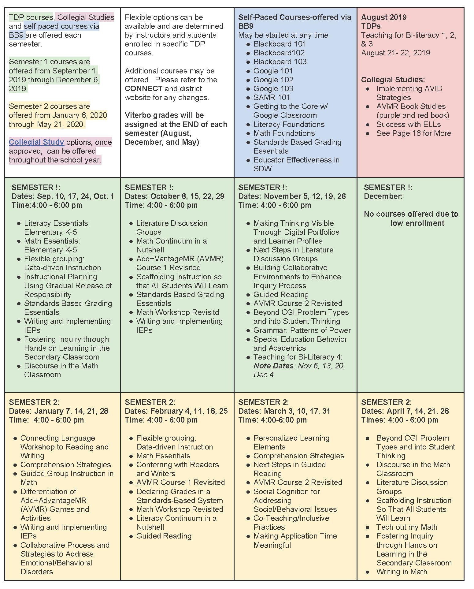 • TDP courses, Collegial Studies and self-paced courses via BB9 are offered each semester.