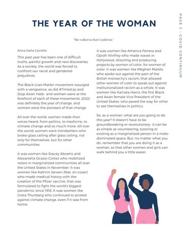 It was women like America Ferrera and Oprah Winfrey who made waves in Hollywood, directing and producing projects by women of color, for women of color. It was women like Meghan Markle, who spoke out against the pain of the British monarchy’s racism, that allowed other women of color to speak out against institutionalized racism as a whole. It was women like Kamala Harris, the first Black and Asian female Vice President of the United States, who paved the way for other to see themselves in politics. So, as a woman, what are you going to do this year? It doesn’t have to be groundbreaking or revolutionary- it can be as simple as volunteering, tutoring or existing as a marginalized person in a maledominated space. But, no matter what you do, remember that you are doing it as a woman, so that other women and girls can walk behind you a little easier.