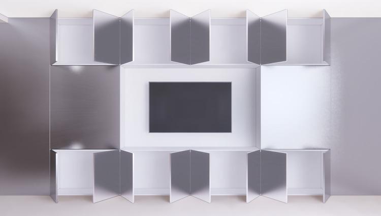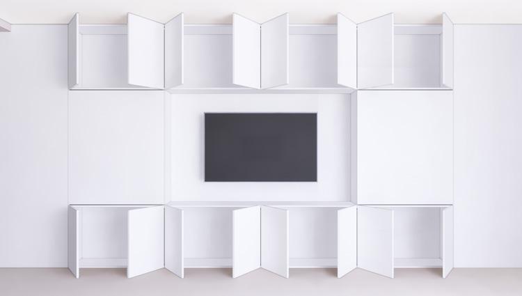 FULL HEIGHT PUSH-TO-OPEN WHITE OAK PLYWOOD CABINET DOOR (WD-1) W/ MILLWORK SHELVING BEHIND, ON EACH SIDE OF MEDIA UNIT