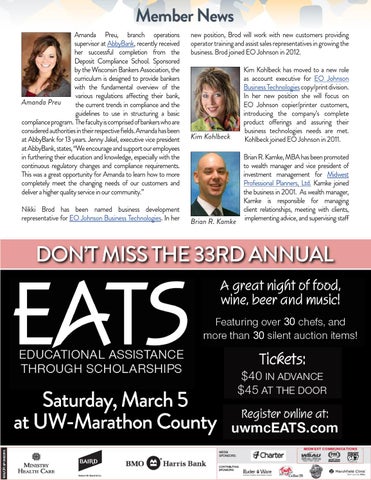 Member News Amanda Preu, branch operations supervisor at AbbyBank, recently received her successful completion from the Deposit Compliance School. Sponsored by the Wisconsin Bankers Association, the curriculum is designed to provide bankers with the fundamental overview of the various regulations affecting their bank, Amanda Preu the current trends in compliance and the guidelines to use in structuring a basic compliance program. The faculty is comprised of bankers who are considered authorities in their respective fields. Amanda has been at AbbyBank for 13 years. Jenny Jakel, executive vice president at AbbyBank, states, “We encourage and support our employees in furthering their education and knowledge, especially with the continuous regulatory changes and compliance requirements. This was a great opportunity for Amanda to learn how to more completely meet the changing needs of our customers and deliver a higher quality service in our community.� Nikki Brod has been named business development representative for EO Johnson Business Technologies. In her
