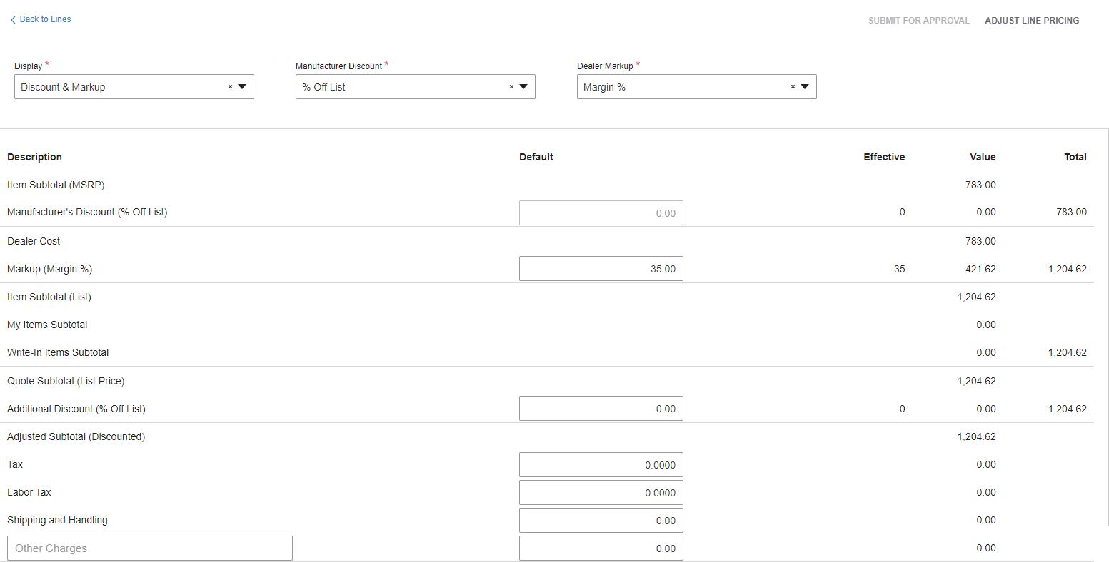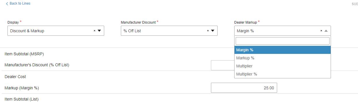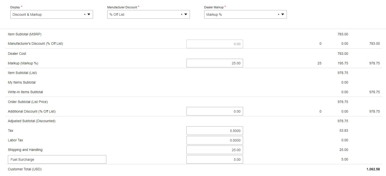 Configurator produces a list price and will calculate your cost. There are two methods available to set margins or markups, additional discounts, tax, etc on the quote.