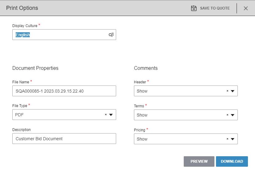1. To send directly to a printer, once the appropriate “Print Options” are selected, follow the steps provided to preview a quote. Once that PDF document is open, at the top right corner, you will find a printer icon. Select that to continue with your printer options then hit print.