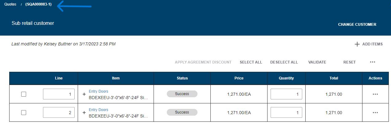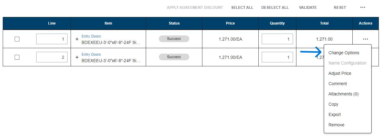 3. Select “Validate” to allow the system to rerun the options and calculate current price. The line status will then change to “Success” to confirm that the line has been validated.