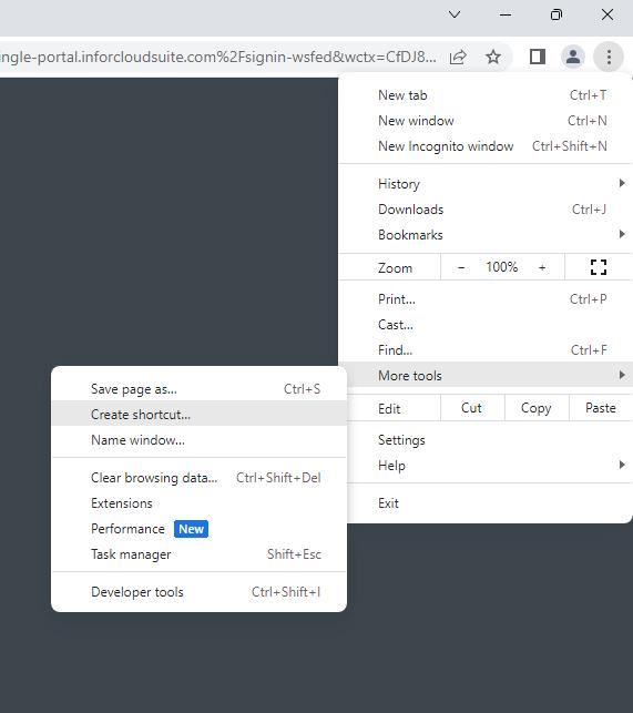 4. In the upper right-hand corner of Chrome, click on the vertical ellipsis, select “More tools” and “Create shortcut…”.