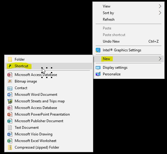 3. Right click anywhere on the desktop and select “New” and “Shortcut”.