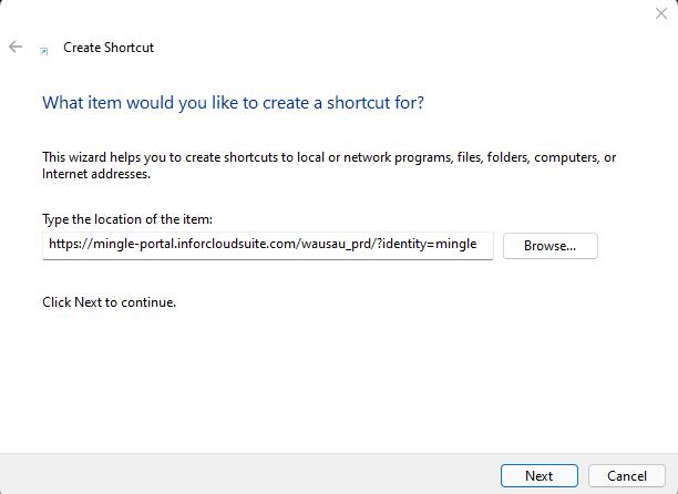 4. The shortcut window will open so you can type the destination of the shortcut. Enter https://mingle-portal.inforcloudsuite.com/wausau_prd/?identity=mingle as the destination and select “Next”.